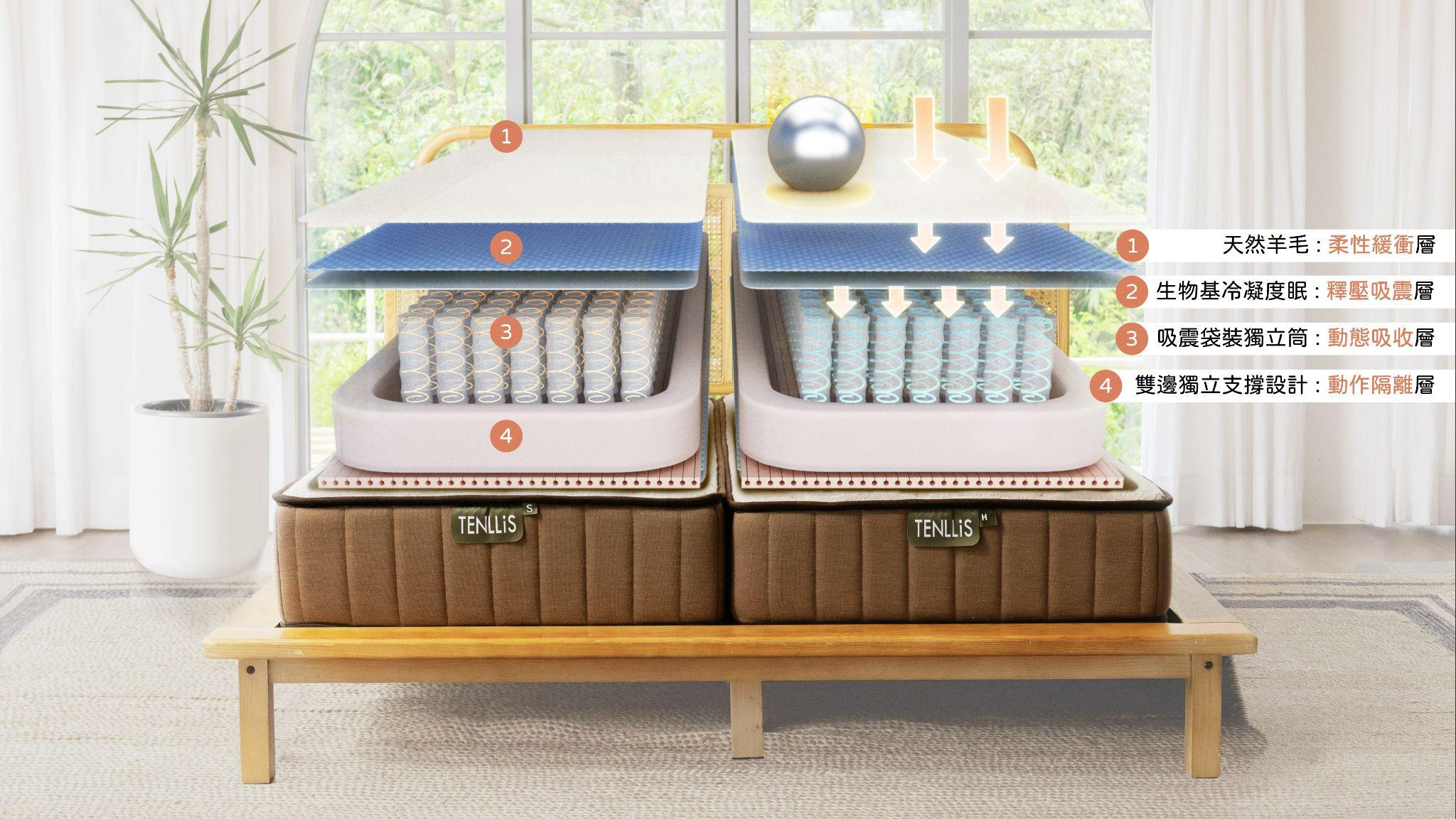 • 完美吸震系統: 床墊採用 四層結構層層配合,能做到「動態輕輕吸收,動作悄然隔離」,確保伴侶的翻身波動只「化為你枕邊的微風」,讓使用者在翻身間依然沉浸夢境。