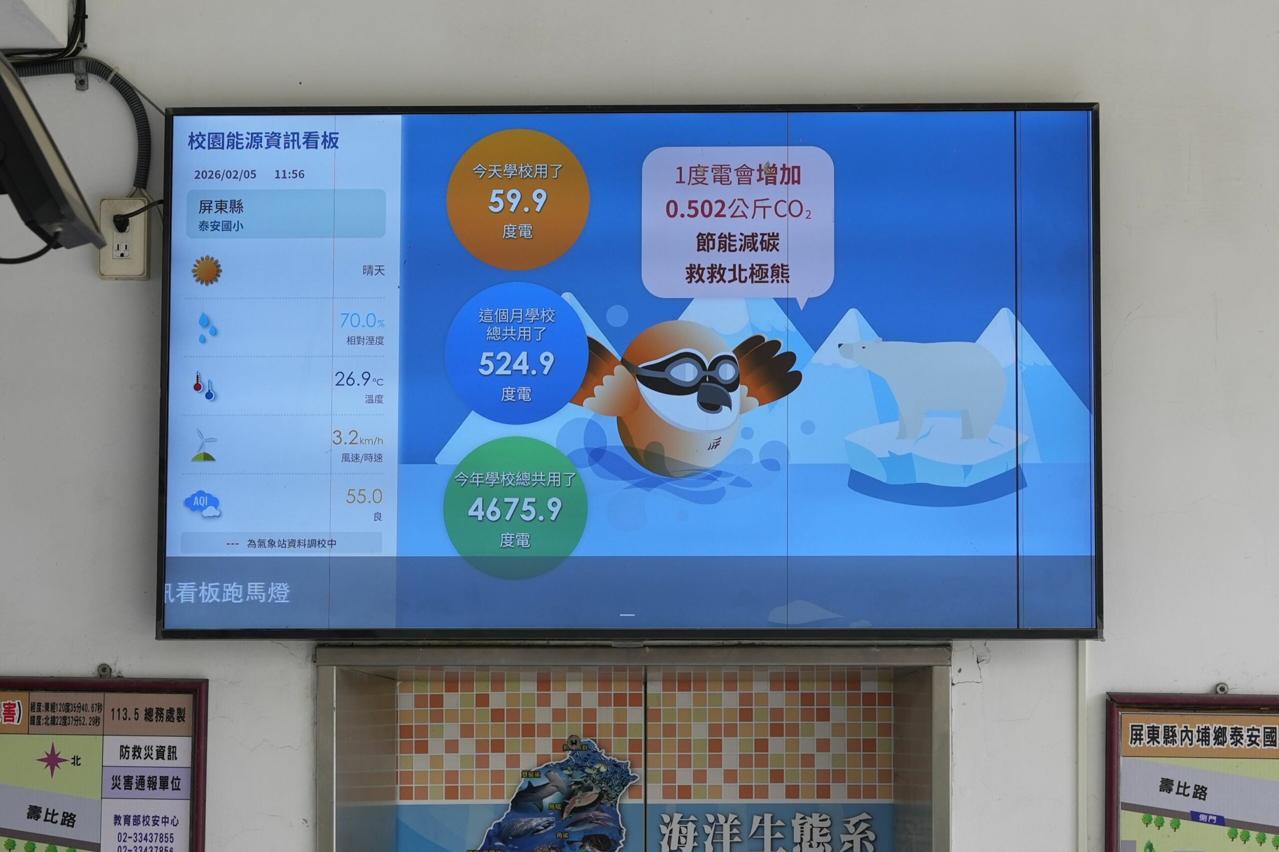 凃淳益主任說,每間教室後方設置智慧電表,數據化讓學生知道自己用多少電。人人從小聽到大的「隨手關燈」,沒有量化很容易淪為口號,但是將1度電換算3塊錢,學生就會相對有感,老師也能帶著孩子討論如何讓下個月電費更便宜,除了讓學生養成節約能源的生活習慣,同時導入智慧控制系統輔助,如走廊、廁所更換成LED感應燈,幫助校園更節能。