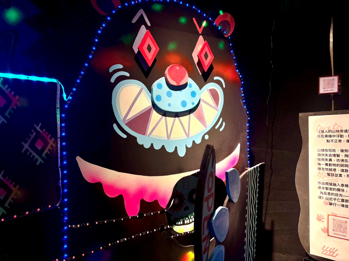 走入燈區,可見張牙的山豬、咧嘴而笑的大黑熊、張嘴嚇人卻帶著反差萌的石虎、佇立樹幹上的草鴞、傳遞訊息的希利克鳥,以及盤旋夜空的蝙蝠,整座山林顯得熱鬧而生動,獵人身旁還跟著兩隻忠誠的獵犬,讓觀眾宛如誤闖一場動物們的夜間派對,藝術家蔣沛珊Yabun Yuma的作品蘊含族群文化的細膩提醒,當觀眾走近作品,打開黑熊的手掌,會看見來自泰雅族的溫馨叮嚀;而希利克鳥在泰雅族傳統文化中,象徵獵人出獵前的重要指引,若鳥鳴悅耳,便代表環境安好、行動順利,展現族人與自然相互傾聽的智慧。