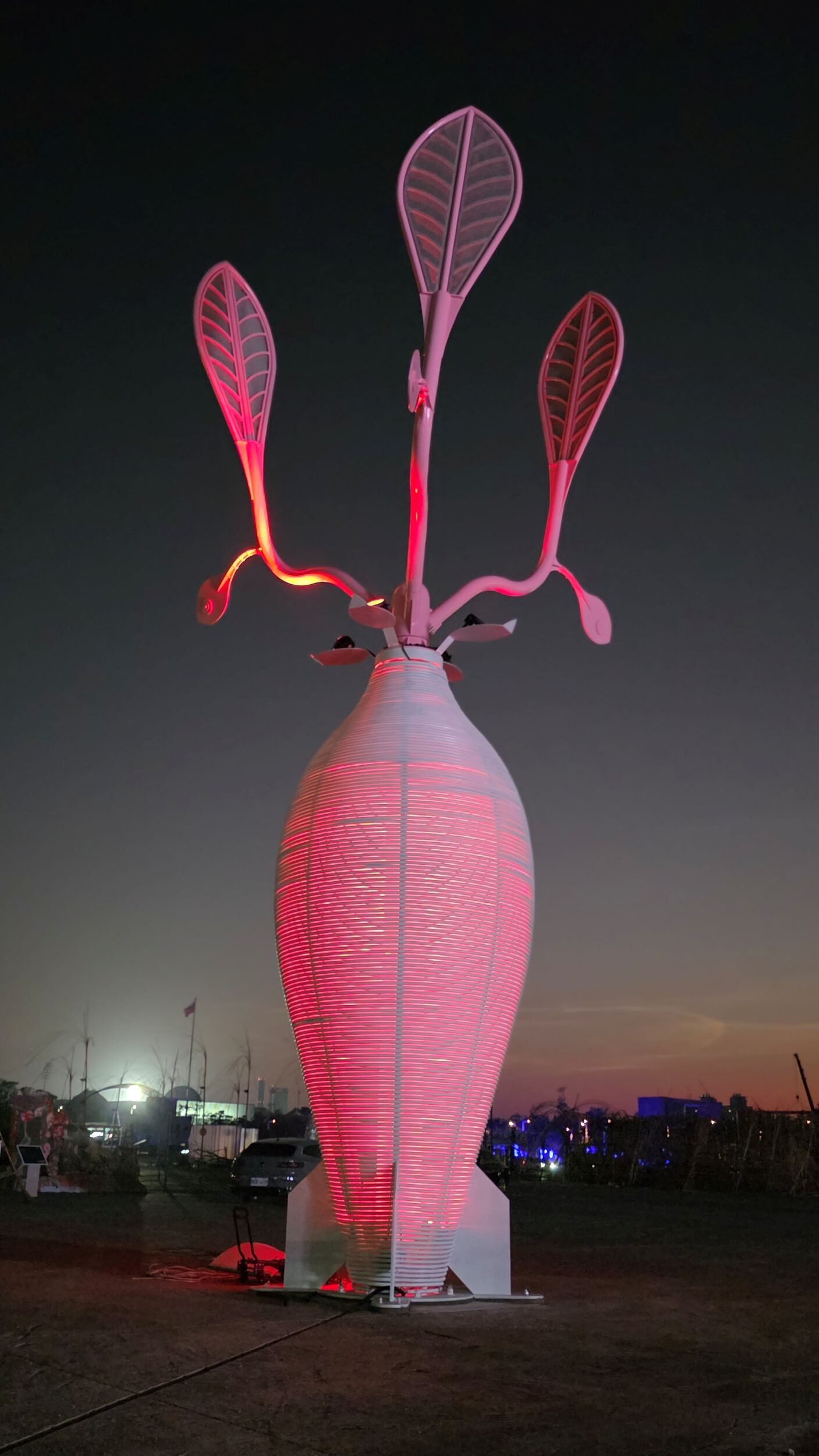 設計團隊更在枝葉結構中導入風動裝置,讓葉片隨風擺動,呼應「生活、生產、生態」三生共融的農村再生理念。夜幕低垂時,燈光自金屬層次間透射而出,交織出漸層光彩,使整座巨樹宛如呼吸般律動,展現人與自然和諧共生的當代表現。