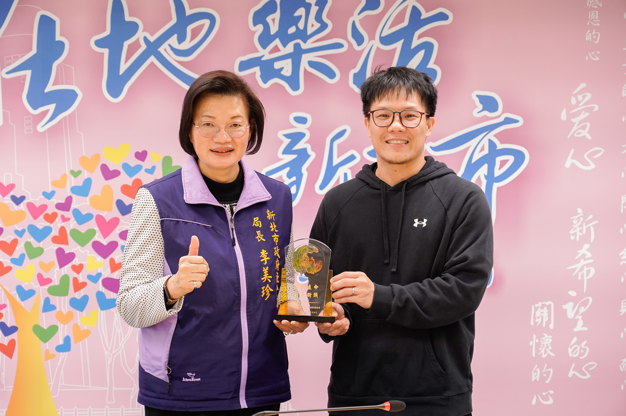 ▲局長李美珍代表侯友宜市長,頒贈「關懷生命、照亮街頭」感謝牌,予思安慈善服務協會共同創辦人張子文。(圖/新北市社會局 提供)