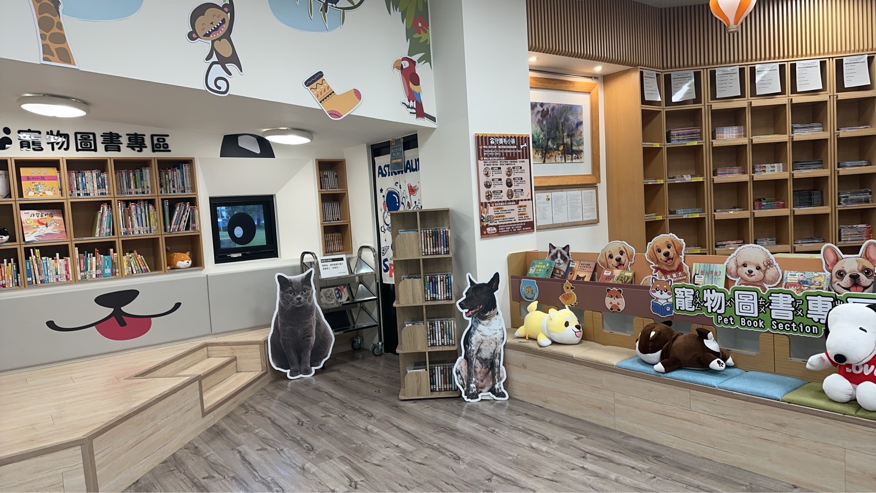 ▲「寵物圖書專區」有狗狗玩偶陪伴,搭配毛寶貝立體造型溫暖空間。(圖/新北市動保處 提供)