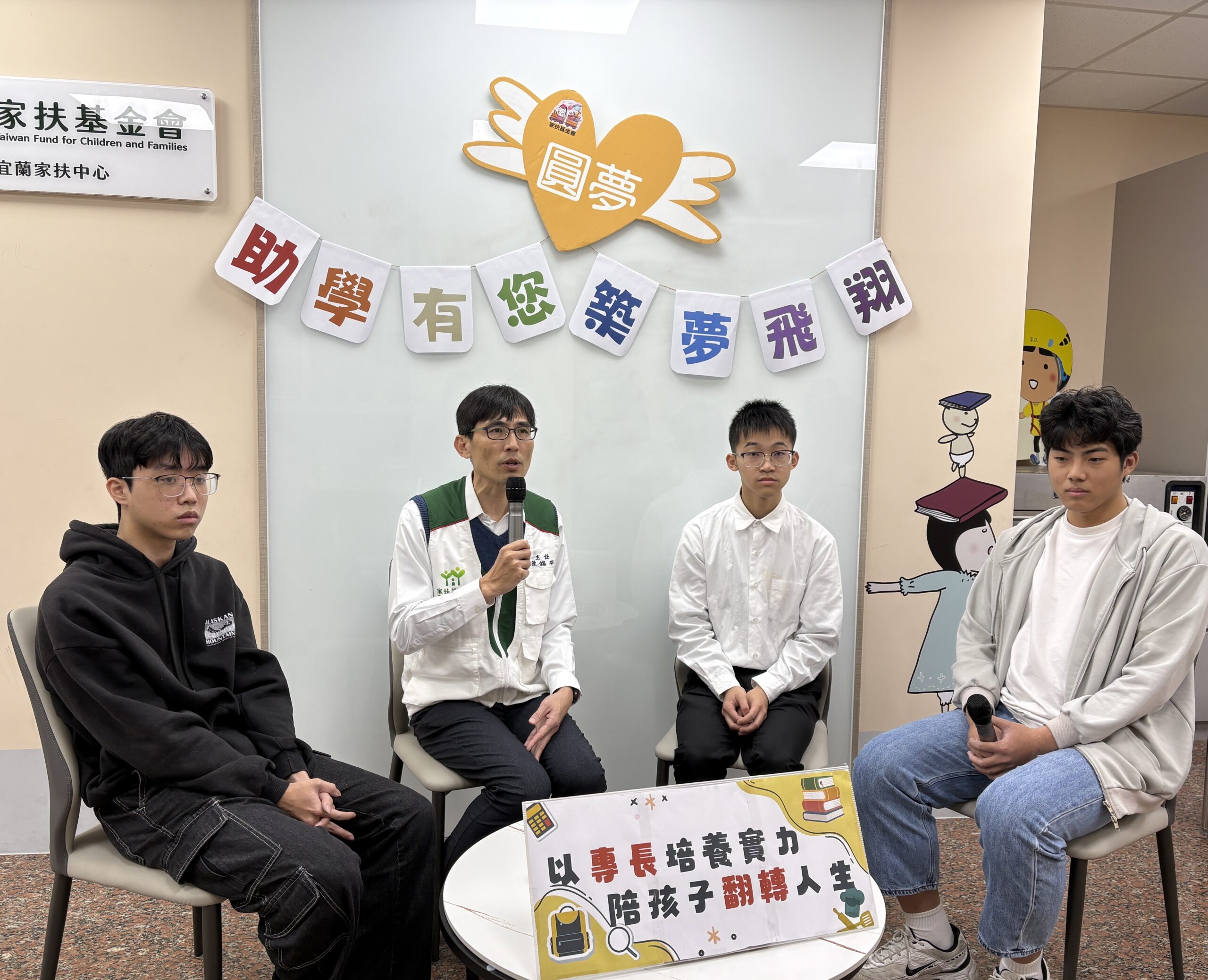 宜蘭家扶中心主任陳錫平,在座談會中與三位在不同專長領域學習的學子對談,過程中三位學子真誠袒露自己真實的生命故事,有很多的挫折、痛苦與極大生活壓力,但也同時展現出弱勢家庭孩子的韌性,在外界提供獎助金的協助下,是能夠實質的給予他們支持的力量,當面對升學與就業的關鍵轉彎處,不再因經濟壓力而折翼。