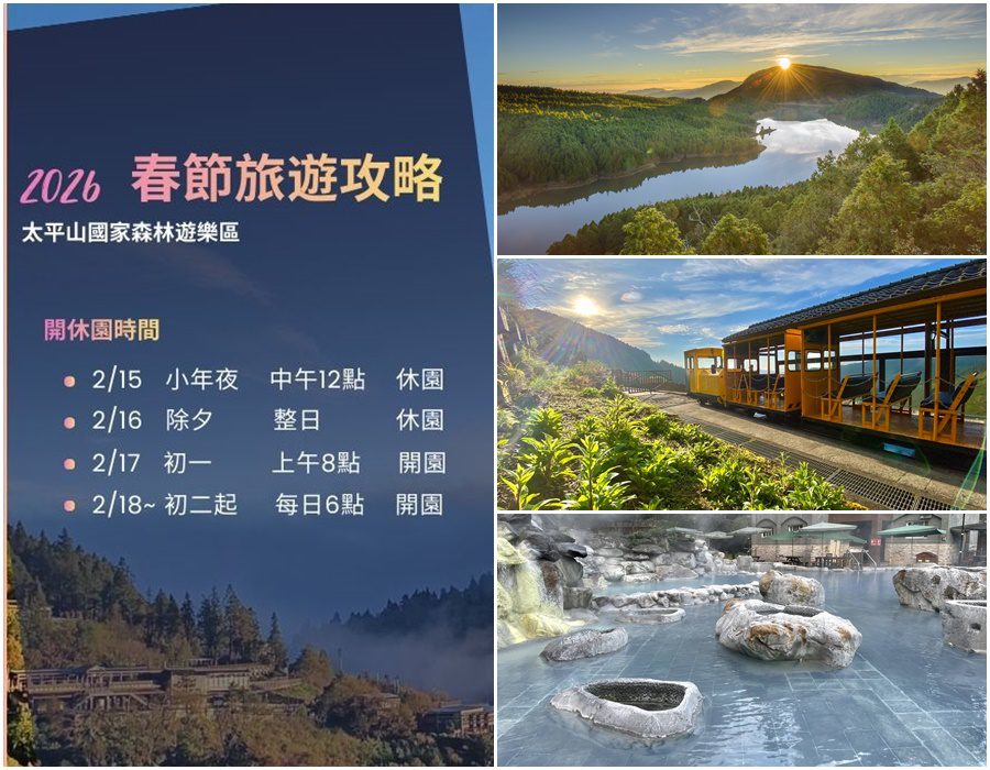 太平山遊樂區2月16日除夕當天休園,小年夜上午7時30分開園、中午12時休園至大年初一2月17日上午8時開園。大年初二起不分平日假日早上6時開園,20時休園。