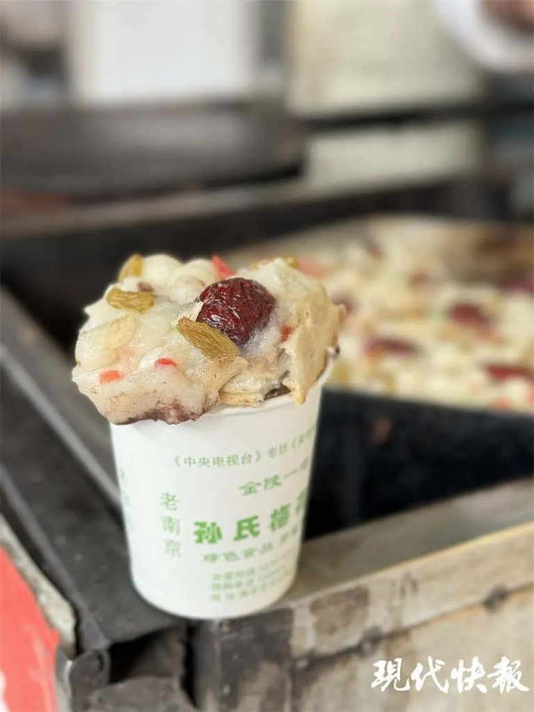 最後,再澆上一層粉漿,鋪上小元宵、紅棗、瓜子仁、紅綠絲、白砂糖作爲收尾。半蒸半煎的烹飪方式,既保留了糯嘰嘰的口感,又讓糕體邊緣酥脆可口。