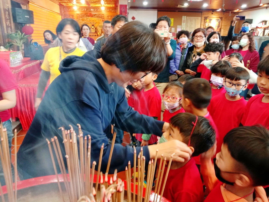 (圖六)▲饒慶鈴縣長及陳銘風市長為在場戰鼓隊的小朋友們佩掛裝有東海媽祖滿滿祝福的香火袋。(圖/東海龍門天聖宮 提供)